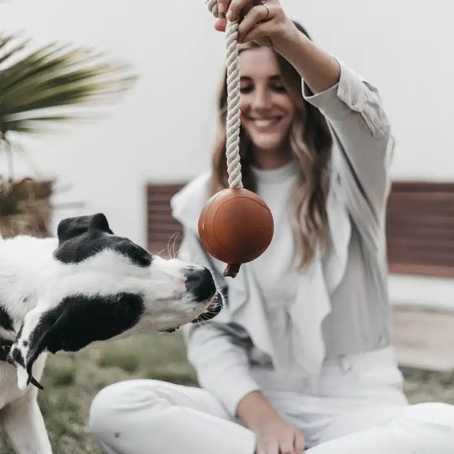 Juguete natural para perros medianos y grandes fabricado con resina natural orgánica y cuerda de algodón.