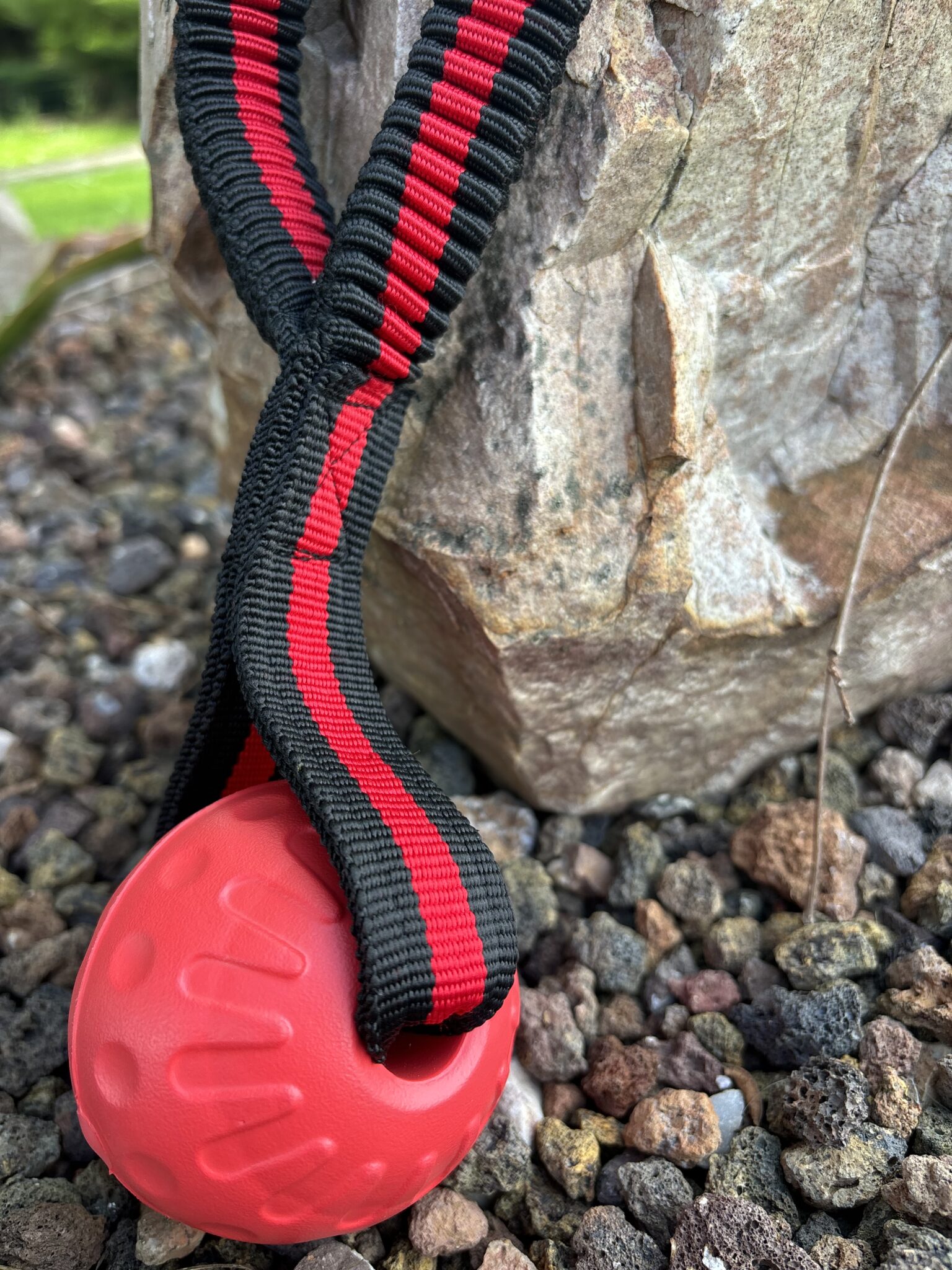 La pelota tiene un diámetro de aproximadamente 7cm y está unida al juguete por medio de una cuerda elástica, lo que permite que el perro lo muerda y tire de él sin que se desprenda fácilmente.